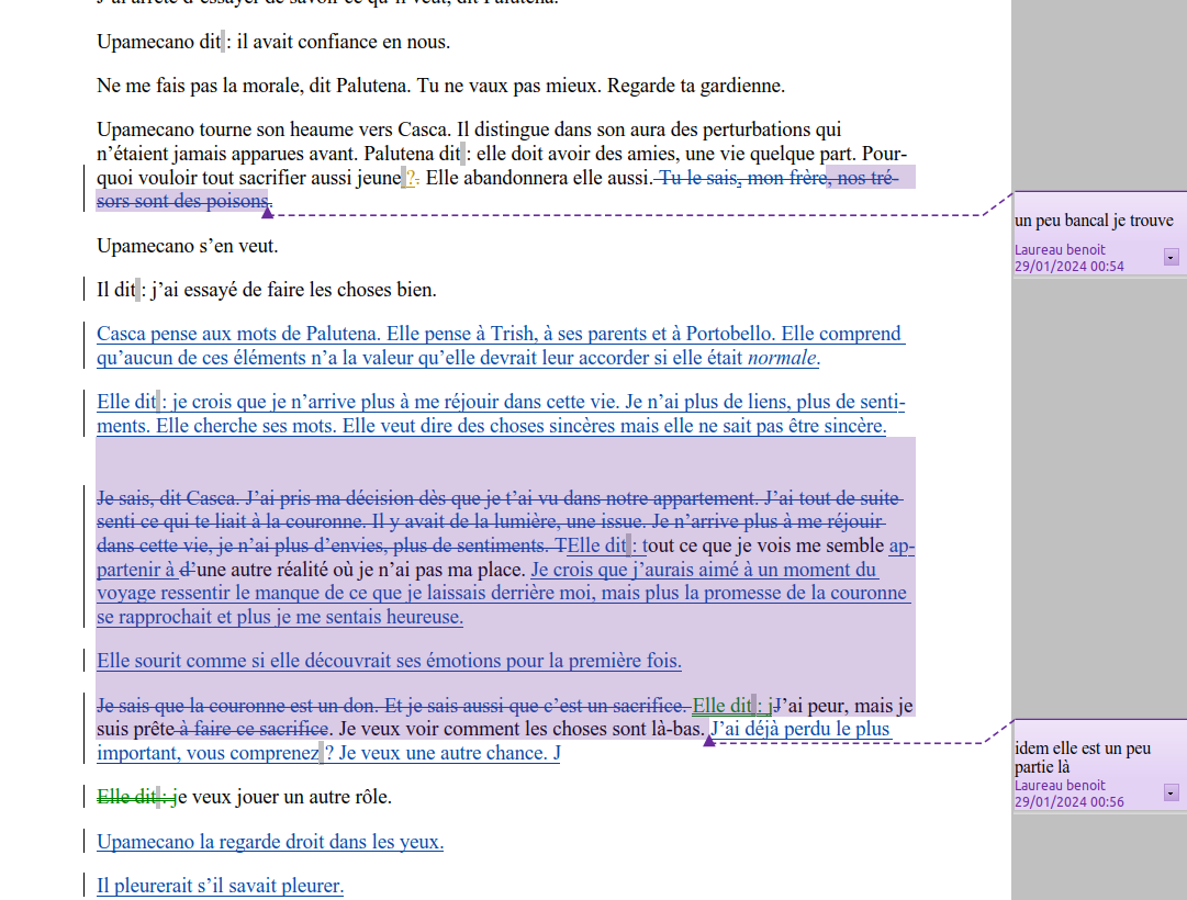 Mes éditeurs avaient parfois la mauvaise habitude de cumuler leurs retours à ceux de la correctrice, en général pour gagner du temps, si bien que le document devenait un énorme bordel où je ne reconnaissais plus rien. C’est important pour moi d’aimer écrire dans mon document, et je n’aime pas créer dans un environnement où chaque faute est soulignée, le vieux texte barré, le nouveau apparaît en commentaire, etc.