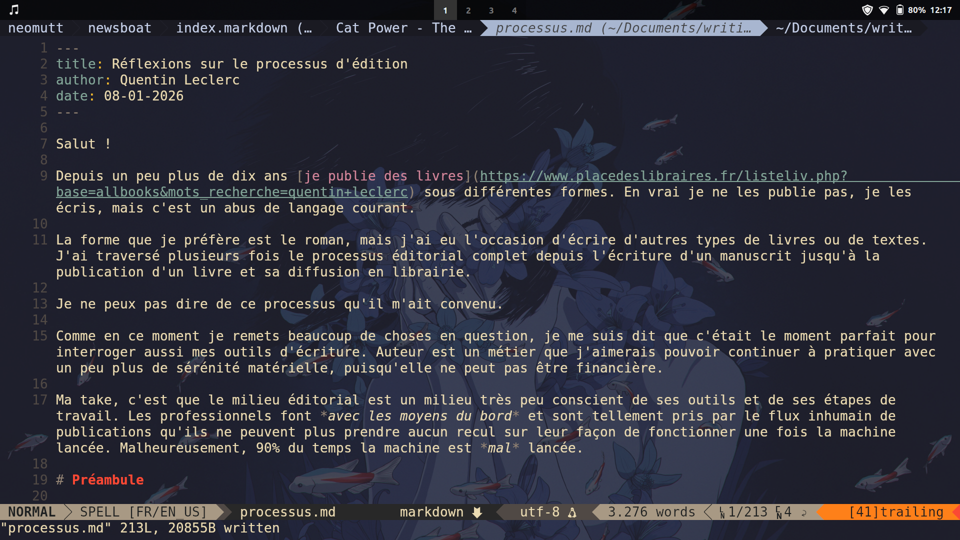 Je sais que c’est une habitude dont il faut que je me défasse. Je dois apprendre à apprécier mon texte pour ce qu’il est dans son environnement de travail, puis de m’en libérer une fois mis en page. vim m’aide dans ce sens-là, à vraiment considérer le texte comme brut, et donc à me concentrer essentiellement sur la structure grammaticale, qui est graphique en soi.